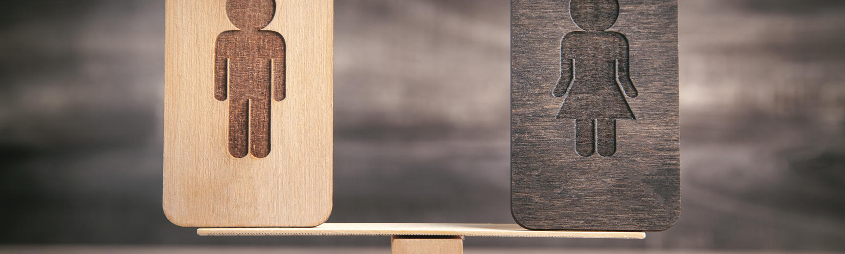 Wooden blocks with male and female symbols balanced on a seesaw, representing gender equality.